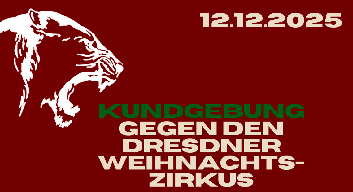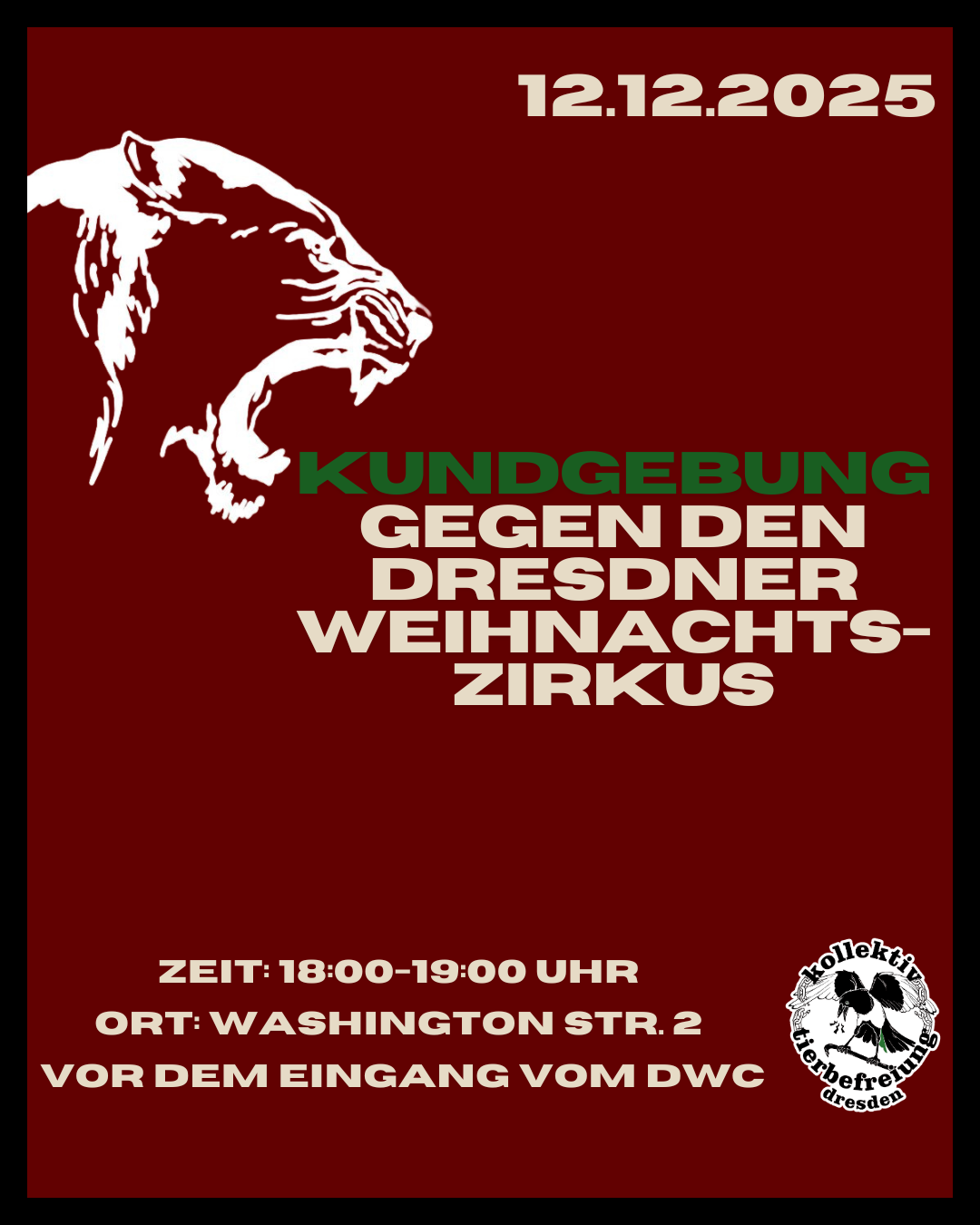Die Tierausbeutung im DWC hört auch im Jahr 2025 nicht auf. Im Gegenteil: Dieses Jahr gibt es wieder Löwen im Programm zu sehen. Für uns ist das inaktzetabel. Egal ob „Wild-“ oder „Nutztiere“, Tiere gehören nicht in die Manege. Wenn ihr auch keinen Bock mehr auf Tierausbeutung und Speziesmus habt, dann kommt zur Kundgebung und seid laut gegen den DWC! Für einen tierausbeutungsfreien Zirkus!