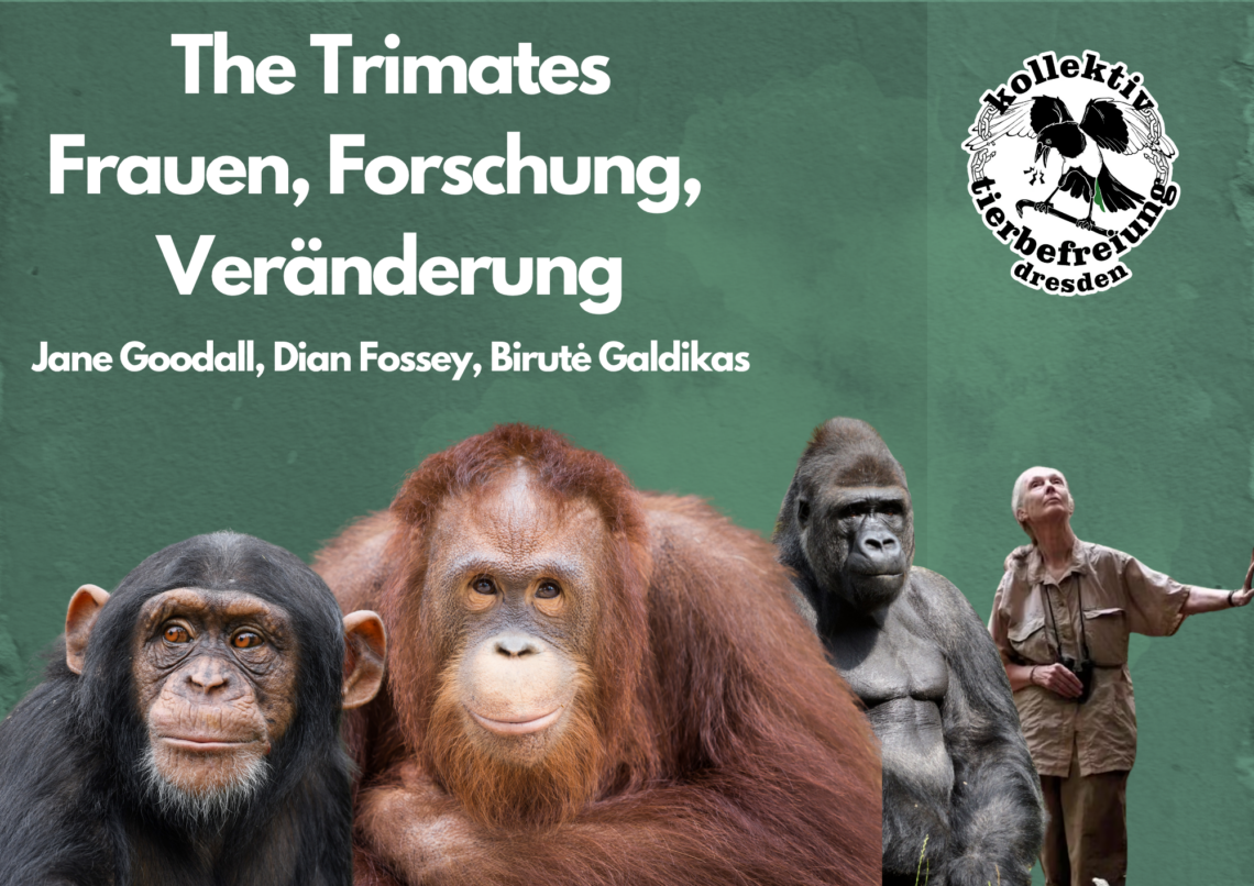Drei Frauen wurden bekannt für ihre herausragende Forschung über Primaten: „The Trimates“, waren Jane Goodall, Dian Fossey, und Birutė Galdikas. Sie haben maßgeblich zu Fragen über die Rechte und Perspektive auf Tiere beigetragen. Durch sie und ihre Arbeit gründeten sich Stiftung und Programme zur Bewahrung von Naturgebieten und Schimpansen, Gorillas und Orang-Utans. Jane Goodall erhielt zu ihrem Tod am 01.10.2025 ebenso wie die 40 Jahre zuvor verstorbene Dian Fossey etliche Nachrufe zur Veränderung dieser Welt. Doch während die Nachwelt genau damit überschwemmt ist, gehen Fragen um koloniale Aspekte, intersektionale Betrachtungen und Veränderungen innerhalb der Menschen zu den Tieren unter. Dies wollen wir beleuchten und dabei eine Mischung aus kritischer Diskussion sowie Analyse und Anerkennung des Erbrachten durchführen.